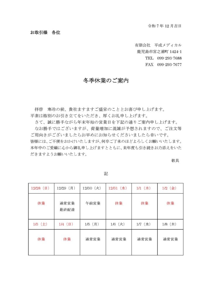 冬季休業のお知らせ 2025.12.01 平素は格別のご高配を賜り誠にありがとうございます。 年末年始の休業について別紙の通りご案内をいたします。 お取引先様には大変ご迷惑をおかけいたしますが、何卒ご了承いただけますようお願い申し上げます。