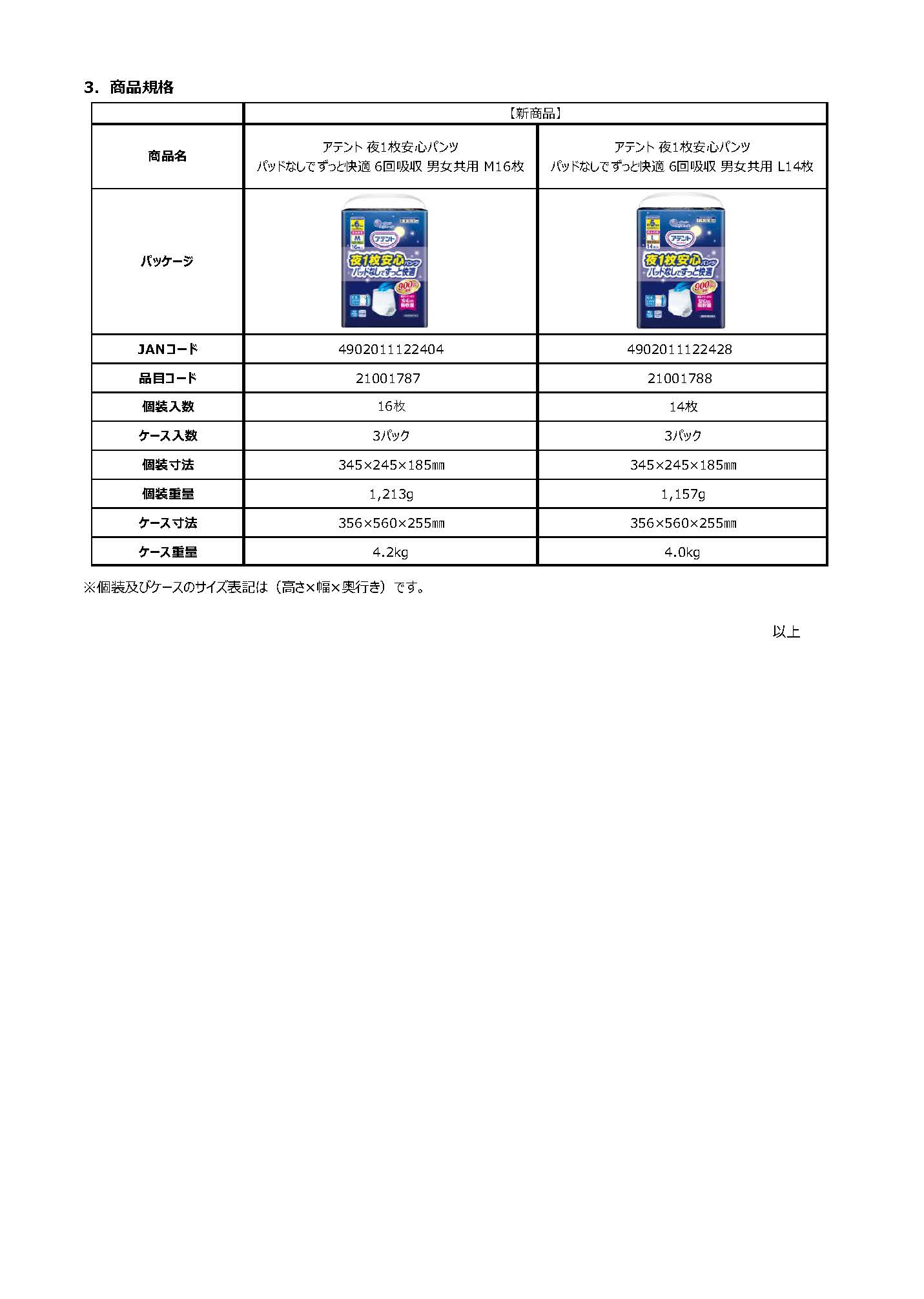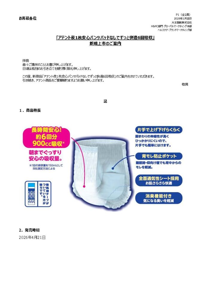 新商品のご案内【大王製紙_アテント】 2026.01.31 日頃より格別のご高配を賜り誠にありがとうございます。 この度、大王製紙株式会社より新商品「アテント夜1枚安心パンツぱっどなしでずっと快適6回吸収」のお知らせがございましたのでご案内いたします。 商品の特徴や仕様については、添付資料よりご確認ください。 発売時期は2026年4月21日を予定しています。
